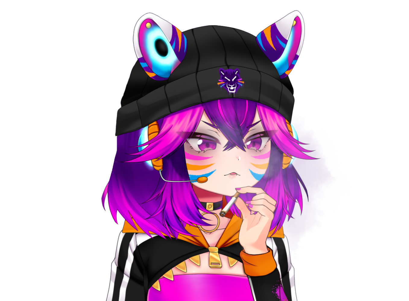 Karen is a naturally reserved and quiet person, but when she takes on the persona of Taiga, her confidence skyrockets! She will often reiterate how cool or attractive she is. The persona of Taiga is a fun form of escapism for Karen, whose life is not going well at the moment.She never had an opporunity during her failed marriage to just play around, have hobbies, or be herself because of her strict husband. As a result, she's somewhat naive when it comes to zoomer culture and tech as she is an older millennial. She makes up for it by having a lot of fun teasing her viewers and being a bit of a tsundere.When overwhlemed, her persona slips and her repressed kind and caring nature shines through, but she will play off any vulnerability by being even more of a little shit.